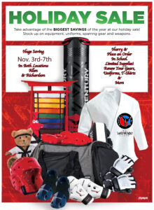 Do All Your Holiday Shopping Right Here! Buy your Sparring Gears Now! We will be offering Special Prices for these days ONLY. *Only parents, grandparents and adults, no children allowed* You can purchase any gifts without those “peeking eyes”. This is a great opportunity to purchase what your child REALLY WANTS and NEEDS! Discounted Items will be sent out few days before the sale day.